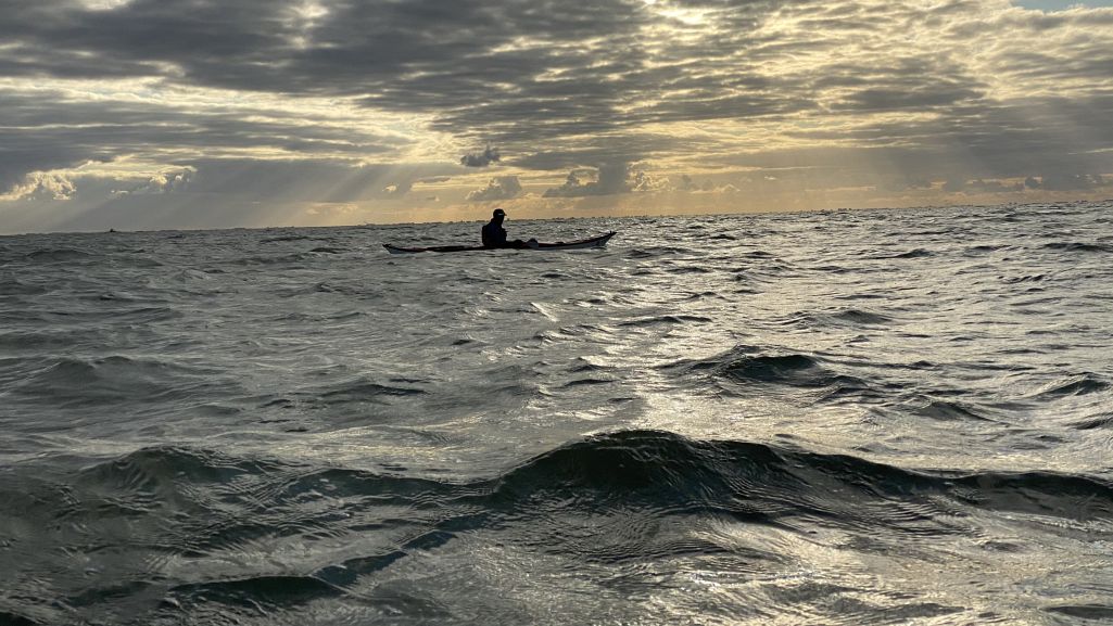 Met de golven schuin tegen en een golfhoogte van 30-60cm danste mijn Orion over de golven. Zijdezacht (ik weet niet hoe ik dat anders kan omschrijven) glijdt ze over elke golf. Heerlijk, zo hoort zeekajakvaren te zijn.