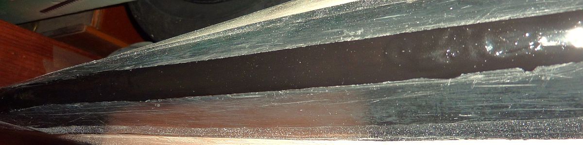 Daar heb ik geen last van omdat die zelfklevende strips nog niet bestonden toen mijn kielstrip werd aangebracht in 1968. Het is dus een zwarte strip van Gelcoat (is van polyester) die met de kwast is aangebracht. Waarom zwart? Omdat zwart duidelijk afsteekt tegen de witte bodem van de kajak zodat je goed kunt zien wanneer je weer moet bijwerken omdat je dan de witte bodem hier en daar door de kielstrip kunt zien.